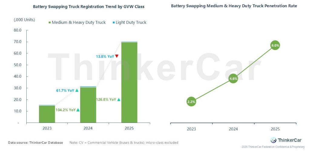 Battery swapping adoption in trucks was heavily concentrated in the medium & heavy duty segment: registrations surged with 104.2% YoY growth in 2024 and 126.8% YoY growth in 2025, reaching 70K units by 2025, while light duty battery swapping truck registrations declined 13.8% YoY in 2025; penetration for medium & heavy duty trucks also rose steadily from 2.2% in 2023 to 8.0% in 2025