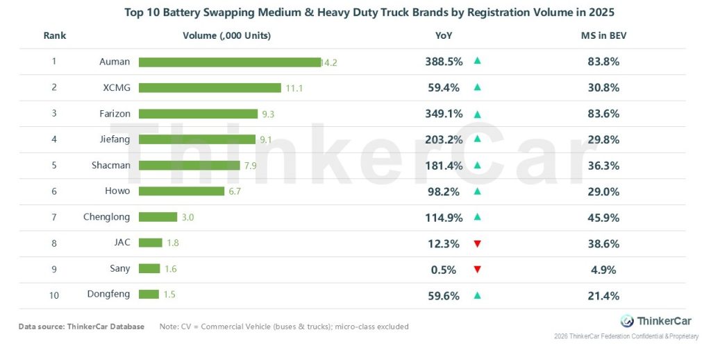 In 2025, Auman led the battery swapping medium & heavy duty truck market with 14.2K registrations and 388.5% YoY growth, followed by XCMG (11.1K) and Farizon (9.3K); notably, Auman and Farizon saw battery swapping models account for over 83% of their own battery electric heavy duty trucks, while most top brands posted strong YoY growth, with only JAC and Sany experiencing declines
