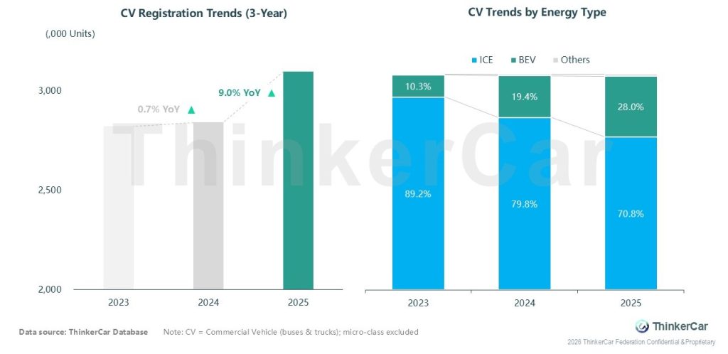 Over the past three years, the commercial vehicle market has seen both volume acceleration and structural shifts: Registrations grew 0.7% YoY in 2023–2024, then surged 9.0% in 2025 to exceed 3 million units. Meanwhile, the energy mix shifted dramatically: ICE share fell from 89.2% (2023) to 70.8% (2025), while BEV share jumped from 10.3% to 28.0%, highlighting rapid electrification