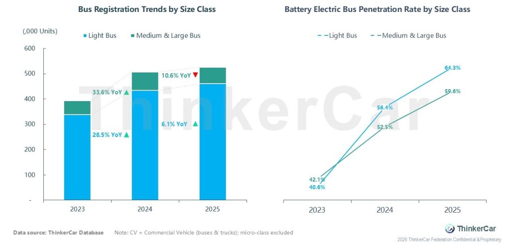 Over the past 3 years, light bus registrations climbed 28.5% in 2024 and 6.1% in 2025, topping 460k units; medium & large bus registrations surged 33.6% in 2024, then fell 10.6% YoY in 2025, stabilizing at ~60k units. BEB penetration rose sharply for both: light buses hit 64.3% (from 40.6%), medium & large buses 59.6% (from 42.1%), with light buses leading electrification