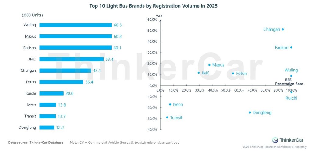 In 2025, Wuling led the light bus market with 60.3K registrations, followed by Maxus (60.2K) and Farizon (60.1K); Changan recorded the strongest YoY growth of over 50%, while Transit, Iveco and Dongfeng saw declines, and Ruichi achieved near-100% BEB penetration, with Wuling, Farizon and Changan also showing high electrification levels