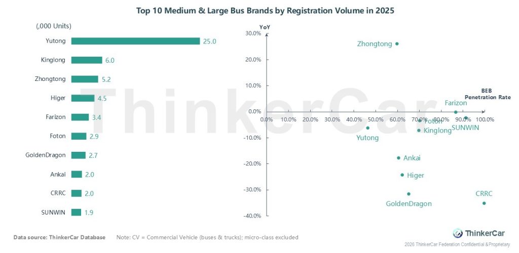 In 2025, Yutong dominated the medium & large bus market with 25.0K registrations, followed by Kinglong (6.0K) and Zhongtong (5.2K); Zhongtong recorded the only positive YoY growth of over 25%, while most other brands declined, and SUNWIN and Farizon achieved near-100% BEB penetration, with Yutong and Kinglong also showing high electrification levels