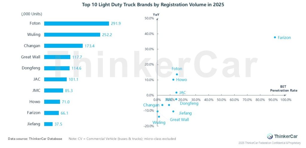 In 2025, Foton led the light duty truck market with 291.9K registrations, followed by Wuling (252.2K) and Changan (173.4K); Farizon achieved the strongest YoY growth of nearly 40%, while Wuling and Great Wall saw declines, and Farizon also posted the highest BET penetration among the top brands
