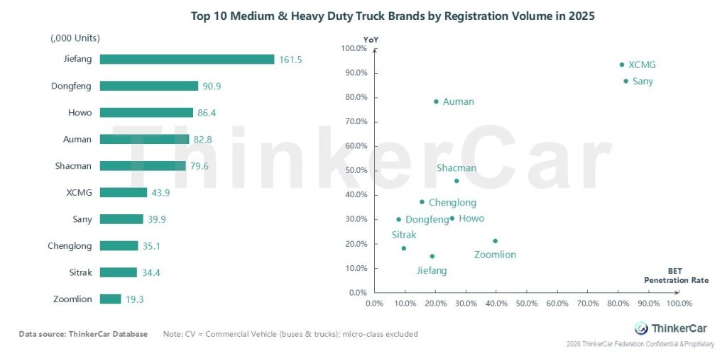 In 2025, Jiefang led the medium & heavy duty truck market with 161.5K registrations, followed by Dongfeng (90.9K) and Howo (86.4K); XCMG and Sany achieved the strongest YoY growth of nearly 100%, and also posted the highest battery electric truck (BET) penetration rates, approaching 100%