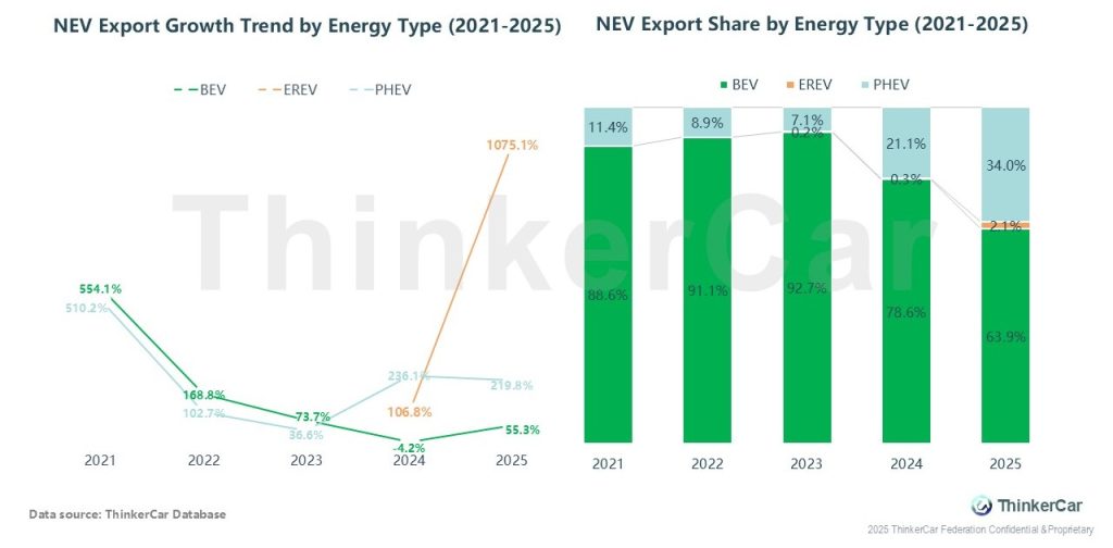 From 2021 to 2025, BEVs led NEV exports, share falling from >88% to 63.9% (2025). PHEVs rose to 34% (from 11.4%); EREVs entered (2.1%) in 2025. Growth: BEVs fluctuated (554.1% up 2021→4.2% down 2024); PHEVs/EREVs grew fast.