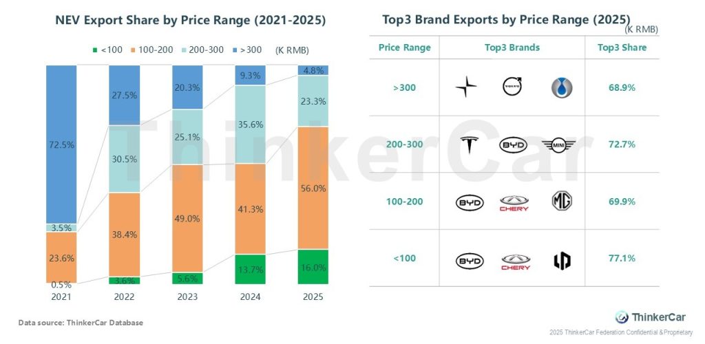 From 2021-2025, NEV export price mix shifts to mid/low tiers: <100K share rises 0.5%→16%, 100-200K hits 56%, >300K drops 72.5%→9.3%. In 2025, Top3 brands in each price tier have high concentration; BYD covers multiple tiers.