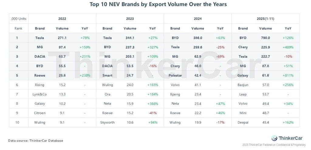 2022-2025: The landscape of Top 10 NEV export brands has shifted. Tesla led in 2022-2023, while BYD claimed the top spot from 2024 onward—BYD’s export volume hit 790.0k units (YoY +126%) in Jan-Nov 2025. Chery rose to 2nd place (225.9k units, +489%); brands like Galaxy and Baojun saw over 200% YoY growth. MG and Tesla experienced ranking fluctuations.