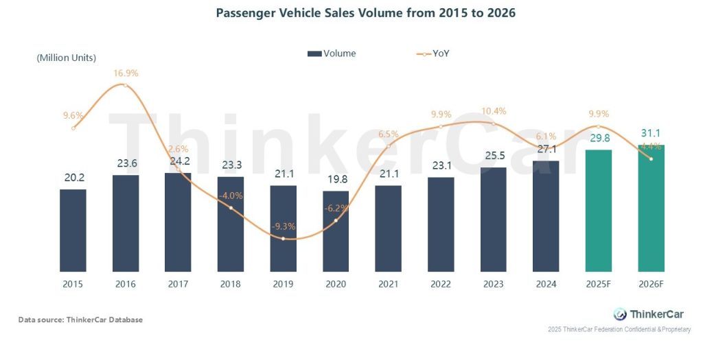 China’s passenger vehicle sales reached 26.7M units (Jan-Nov 2025, +11.2% YoY), with full-year 2025 forecast at 29.8M units (+9.9% YoY). Driven by rising NEV penetration and extended trade-in policies, 2026 sales are expected to hit 31.1M units (+4.4% YoY) with steady growth.