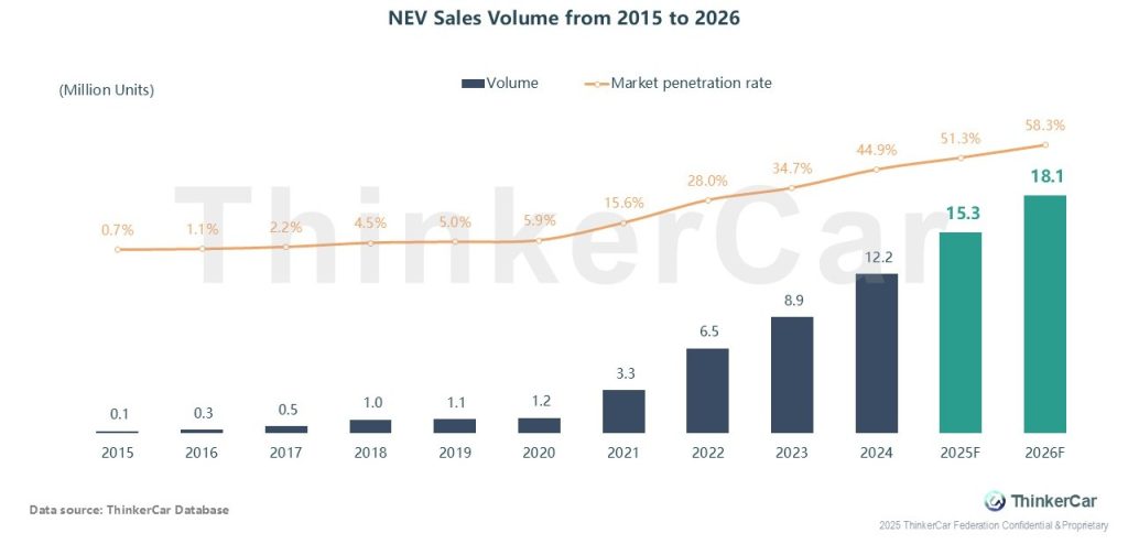 China’s NEV sales reached 13.8M units (Jan-Nov 2025, +29% YoY), with full-year 2025 forecast at 15.3M units and a penetration rate of 51.3%. 2026 will see continued growth but at a moderated growth of 18.6%, with the penetration rate hitting 58.3%.