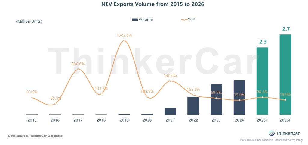 China’s NEV exports maintain rapid growth, with cumulative shipments exceeding 2 million units in Jan-Nov 2025, full-year 2025 forecast at 2.27 million units (+94.2% YoY). 2026 will see continued growth but at a moderated pace, as more Chinese automakers adopt the in-depth layout model of “overseas factory construction + industrial chain synergy”, with full-year exports projected at 2.7 million units.