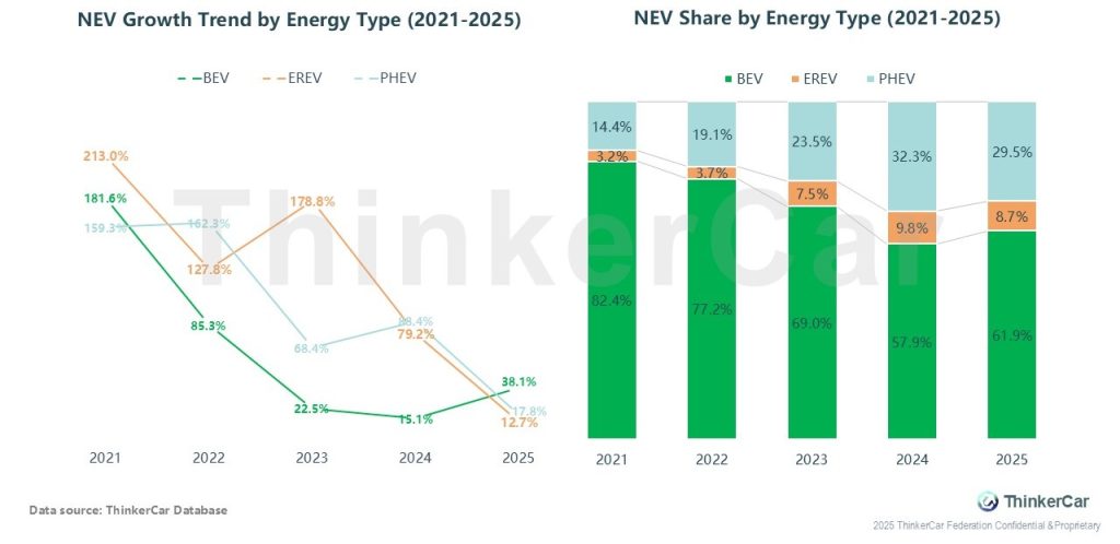 From 2021 to 2025, NEV growth rates generally declined, with BEV’s share falling steadily. Between 2023-2025, NEV growth fluctuated sharply (e.g., EREV surged then dropped), BEV’s share edged down, while EREV and PHEV shares stayed high, making the market more diversified.