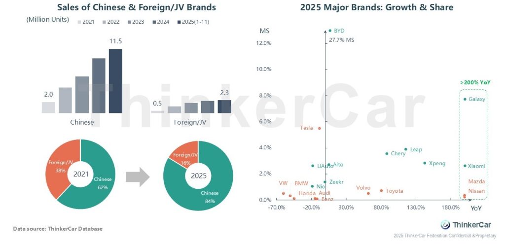 2025 NEV market: Chinese brands strengthen dominance, with share rising from 62% to 84% vs. foreign/JV’s share drop to 16% from 38%. Jan-Nov sales: 11.5M units for Chinese brands, ~5x foreign/JV’s 2.3M. BYD leads with 27.7% share; Galaxy, Xiaomi, Mazda and Nissan grow over 200%, while Volkswagen, BMW et al. post negative growth.
