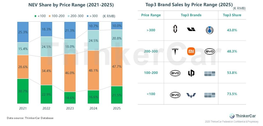 2021-2025 NEV market: 100-200K RMB led share (rising to 47.7%), with >300K share narrowing and <100K recovering from a decline. Brand-wise, the <100K segment had the highest Top3 concentration (73.5%), and BYD (incl. Denza) ranked among top players across segments.